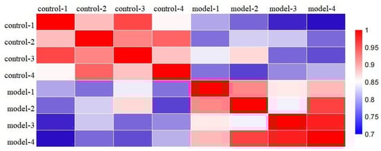 Correlation of the protein intensity among four biological replicates of control and shellfish poisoning model groups, as analyzed with R language. The Pearson color scale bar is shown (right).
