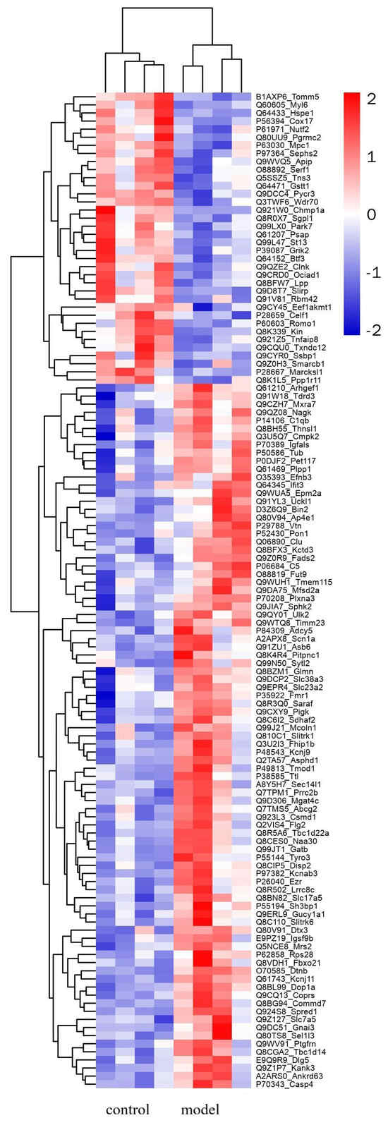 Hierarchical cluster analysis of differentially expressed proteins between control and shellfish poisoning model groups. Rows represent each protein, and columns different groups. Color indicates relative expression of protein: red represents higher expression, and blue represents lower expression.