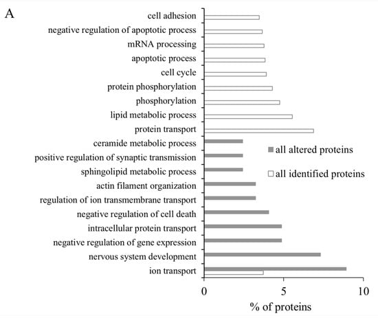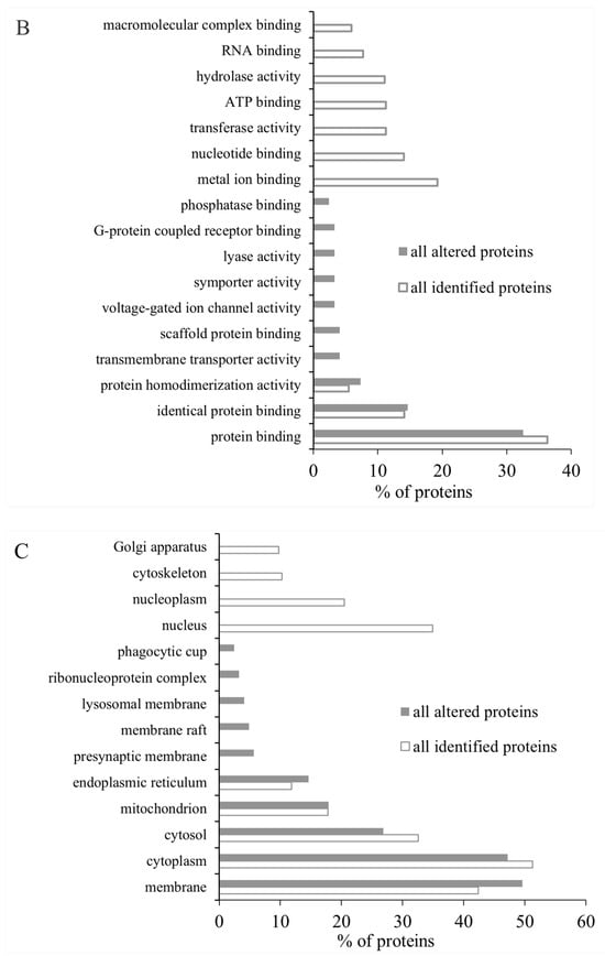 GO classification of all identified proteins and all altered proteins between control and shellfish poisoning model groups. (A) Biological process of all identified proteins and all altered proteins in brain; (B) molecular function of all identified proteins and all altered proteins in brain; (C) cellular component assigned to all identified proteins and all altered proteins in brain. The first 10 subtypes of all identified proteins and all altered proteins in GO classification were analyzed.