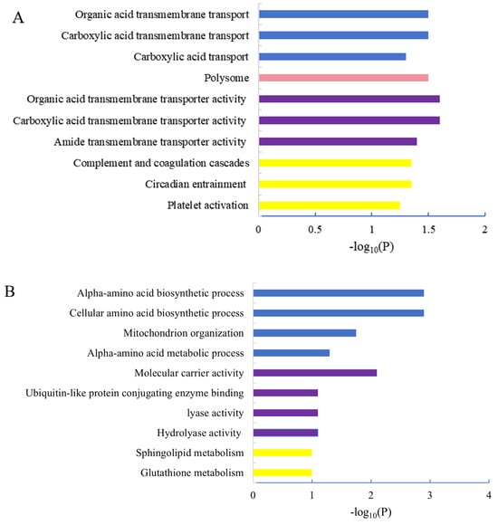 GO classification of up-regulated altered proteins and down-regulated altered proteins between control and shellfish poisoning model groups. (A) GO classification of up-regulated proteins; (B) GO classification of down-regulated proteins. Blue is BP, pink is CC, purple is MF and yellow is KEGG.