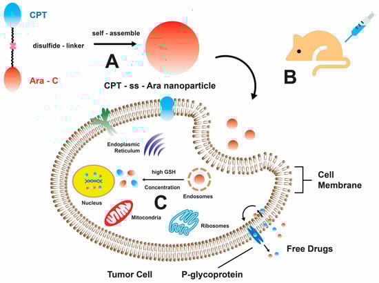 A schematic representation illustrating the self-assembly mechanism of the CPT-ss-Ara conjugate, which exhibits promising prospects in the field of cancer treatment. (A) The amphiphilic CPT-ss-Ara conjugates demonstrate self-assembly characteristics, resulting in the formation of nanoparticles upon introduction to an aqueous solution. (B) The neoplastic cells uptake nanoparticles via the mechanism of endocytosis. (C) The liberation of pharmaceutical compounds takes place via the disulfide bond cleavage process, which is initiated by glutathione (GSH) [55]. Reproduced with permission from W. He and X. Hu et al., “Rational Design of a New Self-Codelivery System from Redox-Sensitive Camptothecin-Cytarabine Conjugate Assembly for Effectively Synergistic Anticancer Therapy”, published by John Wiley and Sons, 2017.