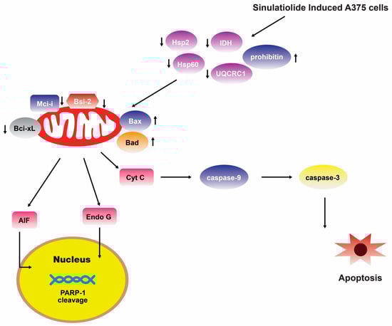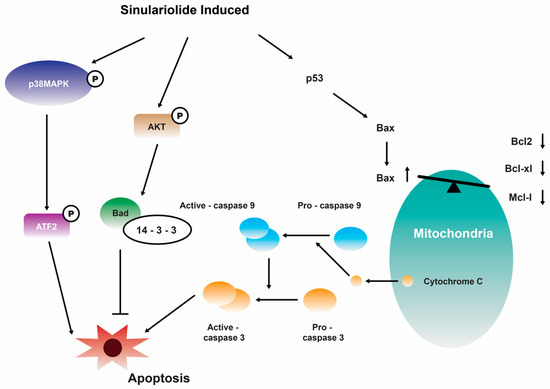Sinulariolide 14 induces A375 melanoma cell apoptosis through the mitochondrial-related apoptosis pathway and activation of the caspase cascade [109]. Reproduced from Li, H.H.; Su, J.H.; Chiu, C.C.; Lin, J.J.; Yang, Z.Y.; Hwang, W.I.; Chen, Y.K.; Lo, Y.H.; and Wu, Y.J. “Proteomic investigation of the sinulariolide-treated melanoma cells A375: effects on the cell apoptosis through mitochondrial-related pathway and activation of caspase cascade”, published by MDPI, Marine Drugs, 2013.