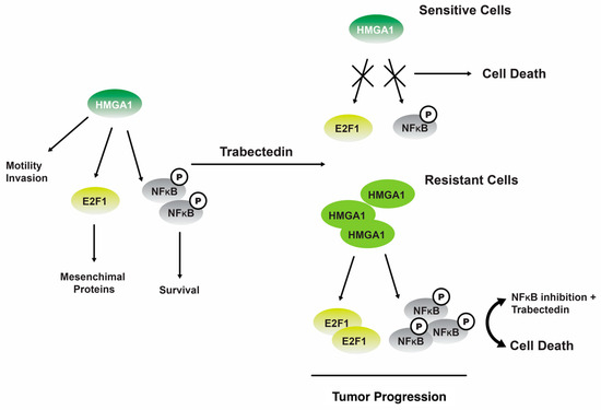 The interplay between the HMGA1 and NFkB signaling pathways trabectedin 19 exerts its inhibitory effects on HMGA1 expression and function by binding to the minor groove of DNA in sensitive cells, ultimately leading to cellular apoptosis. In cells that exhibit resistance, the administration of 19 leads to upregulation of HMGA1 expression and activation of NFkB, thereby promoting the progression of tumors [124]. Reproduced from Loria, R.; Laquintana, V.; Bon, G.; Trisciuoglio, D.; Frapolli, R.; Covello, R.; Amoreo, C.A.; Ferraresi, V.; Zoccali, C.; Novello, M. et al. “HMGA1/E2F1 axis and NFkB pathways regulate LPS progression and trabectedin resistance”, published by Springer Nature, Oncogene, 2018.