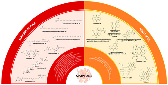 Throughout the course of time, a multitude of bioactive compounds derived from marine sources have been isolated and subjected to rigorous research. Nevertheless, a limited number of compounds have demonstrated effectiveness as inducers of apoptosis and have progressed to the stage of being tested in clinical trials [17,19]. These compounds are derived from a variety of organisms and exert their effects through multiple molecular mechanisms, targeting numerous pathways of apoptosis. Among the first marine-derived compounds approved for cancer treatment (sarcoma and ovarian cancer) is trabectedin [21,22]. It was initially isolated from a marine ascidian (Ecteinascidia turbunata); however, synthetic trabectedin is already available. Moreover, a synthetic version of trabectedin has since been developed and is now commercially accessible. Notably, this compound impedes trans-activated transcription and interact with DNA repair proteins involved in the synthesis of cytokines, chemokines, and anti-tumor agents [23].