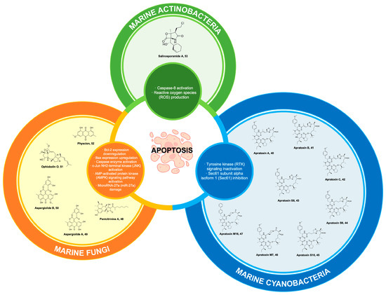 Marine-derived compounds can target apoptotic pathways in cancer cells by inducing cell death in multiple ways, such as by targeting cell cycle arrest [18], interfering with DNA [19] and mediating mitochondrial interactions [20]). In the case of didemnin, it exhibits a binding affinity towards the minor groove of DNA, which impedes the activity of transcription factors and DNA repair mechanisms. Consequently, this disruption leads to the activation of apoptosis [19]. In contrast, lamellarin D induces apoptosis through pore formation in the inner mitochondrial membrane, resulting in the activation of caspases and the subsequent initiation of apoptosis [20].