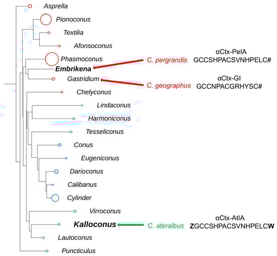 This study focuses on another venom component that was isolated using bioactivity-guided purification and was shown to belong to the αCtx family, a well-characterized group of peptide toxins that target nicotinic acetylcholine receptors (nAChRs). When purified from venom, the amino acid sequence of this peptide was strikingly similar to a previously characterized αCtx from a fish-hunting cone snail, Conus pergrandis []. A phylogenetic tree of the genus Conus showing the relationship between Embrikena and Kalloconus lineages, which contain C. pergrandis and C. ateralbus, respectively, is shown in Figure 1. Given their divergent biology and phylogenetic distance from one another, it was not expected that these two species would have any highly homologous venom components.