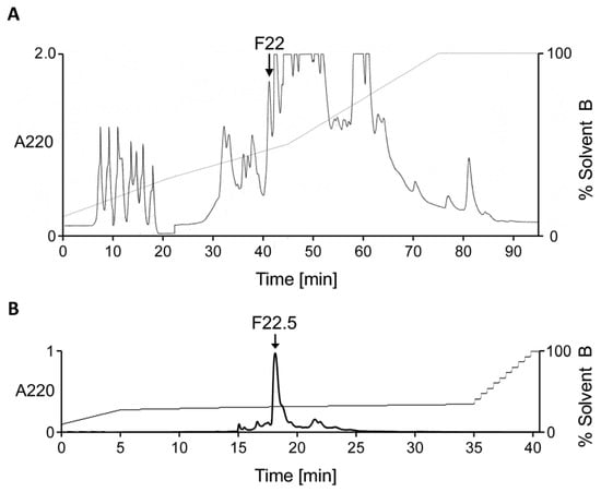All fractionations were purified using a C18 Vydac Monomeric (238EV54, 250 mm × 4.6 mm, 5 µm particle size). The absorbance was monitored at 220 and 280 nm and all fractions were stored at −80 °C.