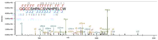 The crude HPLC fractions were analyzed using Matrix-Assisted Laser Desorption/Ionization Time of Flight (MALDI-TOF, Applied Biosystems, Foster City, CA, USA) mass spectrometry at the Mass Spectrometry Core, Salk Institute for Biological Studies, La Jolla, CA, USA. To determine the number of cysteines, a DTT reduction and 4-vinylpyridine alkylation was employed on the pure peptide. To 177 µL of the pure peptide (HPLC sub-fraction 22.5), 10 µL of 0.5 M Tris base (pH 7.5) and 52 µL of 50 mM DTT were added, the reaction mixture was gently vortexed, and the solution was incubated at 65 °C for 30 min. Next, 1.6 µL of 4-vinylpyridine was added, and the reaction was mixed and kept in the dark for ~20 min at RT. Finally, the reaction mixture was diluted with at least 2 volumes of the HPLC buffer A and was subjected to LC separation with fraction collection, using the same gradient described for sub-fractionation of the venom. For comparison, a blank run was conducted using the reduction–alkylation solution but without including the peptide.