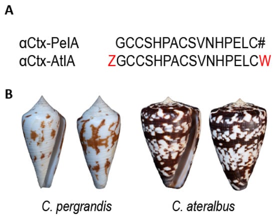 αCtx-PeIA and αCtx-AtIA sequence and shell comparison. (A) Residues that differ between the two peptides are indicated in red; # denotes C-terminal amidation. (B) Dorsal and ventral views of C. pergrandis and C. ateralbus shells.