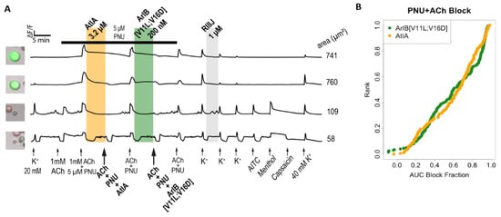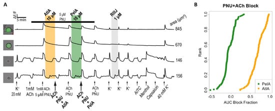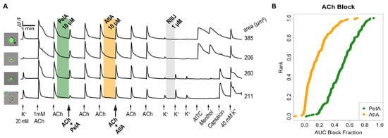 Next, the activity of αCtx-AtIA on α7-subtype expressing DRGs was determined using protocol two (Figure 7). Application of ACh did not cause calcium influx in these cells; however, co-application of ACh and PNU uncovered a calcium response, suggesting the expression of α7 nAChR in these neurons (Figure 7A). PNU was applied to the bath solution for 33.5 min, as indicated by a black horizontal bar, and the cells were exposed to serial applications of 1 mM ACh+PNU at 7 min intervals. As illustrated in the figure, αCtx-PeIA did not inhibit the ACh+PNU-induced calcium influx, while αCtx-AtIA significantly blocked it. Figure 7B shows the quantitative measurements of αCtx-PeIA and αCtx-AtIA treatment on 114 ACh+PNU-responsive neurons obtained from four experimental trials. αCtx-PeIA did not inhibit the ACh+PNU-induced calcium influx, while αCtx-AtIA treatment blocked, on average, 69.5% of the response magnitude. Figure S3B (Supplementary Materials) illustrates the number of neurons that were significantly blocked at an experiment-wide threshold of 0.05%. Only 2 out of 114 neurons showed a block after applying αCtx-PeIA. In contrast, 60 out of 114 cells showed a significant block after applying αCtx-AtIA. The effect of each peptide on each cell was estimated from a multiple linear regression (see Materials and Methods).