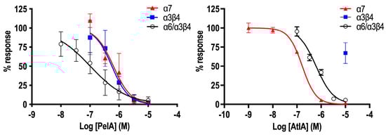 Following the data obtained through Constellation Pharmacology, αCtx-PeIA and αCtx-AtIA were tested on the subtypes of mouse nAChR previously identified in DRG neurons, namely α7, α3β4, and α6β4, represented here as α6/α3β4 (a chimeric expression construct used to improve expression of an otherwise poorly expressing receptor subtype) (Table 2, Figure 9) []. αCtx-AtIA showed no activity on α3β4 when tested at 10 μM concentration and ~5-fold loss of potency on α6/α3β4 nAChRs when compared to αCtx-PeIA, which is consistent with the activity observed in DRGs. αCtx-PeIA blocked those subtypes with an IC50 = 0.57 µM and 0.1 µM, respectively. When tested on α7, αCtx-AtIA showed 4-fold higher potency than αCtx-PeIA, with an IC50 = 0.16 µM.