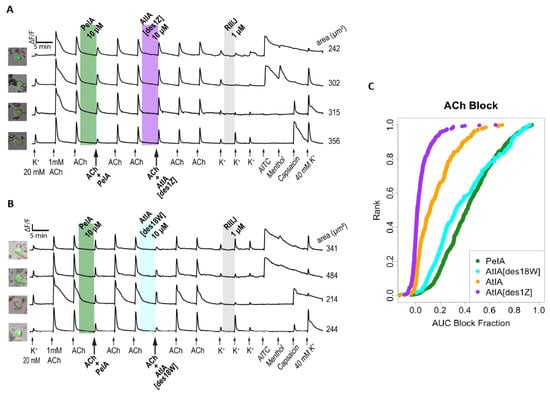 The bioactivities of αCtx-PeIA and αCtx-AtIA were compared by monitoring the ACh-induced calcium influx signals before and after the application of αCtx-PeIA and αCtx-AtIA. Figure 6A shows traces of neurons in which 10 μM αCtx-PeIA inhibited ACh-induced calcium influx, while 10 μM αCtx-AtIA did not, suggesting that these two peptides have different selectivity for nAChR subtypes in DRG neurons. αCtx-PeIA showed potent inhibition of an α3-, α6-, and β4- containing nAChR subtypes, while αCtx-AtIA did not. The arrows in Figure 6A indicate applications of pharmacological stimuli that lasted 15 s. The column on the left shows a bright-field image of each cell overlaid with the fluorescent image obtained from green fluorescence protein expressed in the same neurons (to mark calcitonin gene-related peptide-expressing neurons). The x-axis indicates time, and the y-axis is the normalized ratio of 340/380 nm ([Ca]i dual wavelength measurement). The initial 20 mM KCl application was to identify neurons, followed by 1 mM ACh applications to identify neurons expressing nicotinic receptors. The shaded area indicates the incubation of the peptides and other pharmacologic agents in the bath. Additional pharmacological stimuli such as 1 μM conotoxin kM-RIIIJ (RIIIJ), 100 μM allyl isothiocyanate (AITC), 400 μM menthol, and 40 mM KCl were applied to identify different cell types. Figure 6B displays the results from 220 ACh-responsive neurons obtained from six different experimental trials. Each neuron was ranked on the y-axis according to the magnitude of block by αCtx-AtIA on the x-axis (0 = no block, 1 = complete block). On average, αCtx-PeIA blocked 49.8% of the response magnitude while αCtx-AtIA inhibited only 11.5%. Figure S3A (Supplementary Materials) shows the count of ACh-responsive cells that were significantly blocked at an experiment-wide threshold of 0.05% (see Materials and Methods, Section 4.5). This illustrates the effects of the two peptides: 104 cells exhibited a significant block for both peptides, with a significantly lower potency for αCtx-AtIA, while 101 cells showed a significant block with αCtx-PeIA and a non-significant block with αCtx-AtIA.