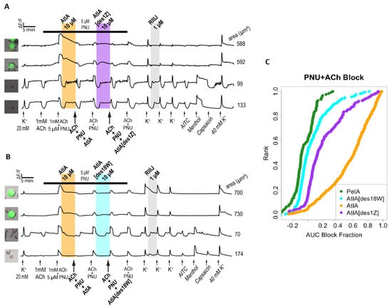 Effects of αCtx-AtIA[des1Z] and αCtx-AtIA[des18W] on ACh+PNU-responsive mouse DRG neurons. (A,B) The phenotypic effects of 10 μM αCtx-AtIA[des1Z] and αCtx-AtIA[des18W] in comparison to αCtx-AtIA on ACh+PNU-responsive neurons. (C) The reduction in calcium response (block) for all cells due to application of indicated αCtx was plotted as a cumulative distribution function (cdf). Each cell is ranked on the y-axis according to the magnitude of block (x-axis).