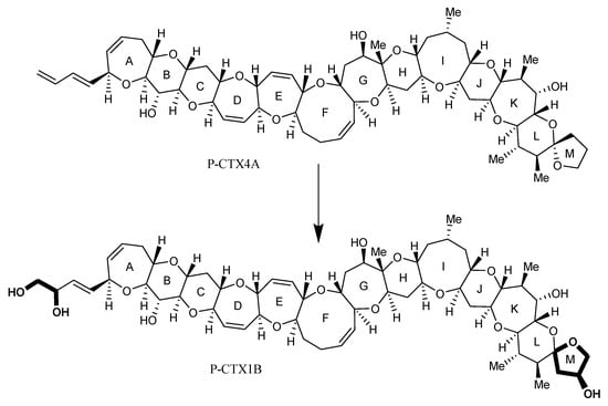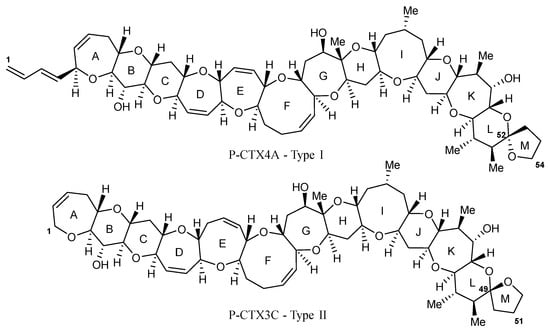 The genus Gambierdiscus produces a complex array of bioactive, cyclic polyether, hydrophilic and lipophilic metabolites that range in toxicity and mode of action. These include ciguatoxins (CTXs), maitotoxins (MTXs) and gambierones. CTXs are a class of lipophilic marine biotoxins that accumulate in fish species, marine invertebrates, such as echinoderms (e.g., urchin, Tripneustes gratilla, and starfish, Ophidiaster ophidianus), gastropods (e.g., cone snails, Conus spp.) and bivalve molluscs (e.g., the giant clam, Tridacna maxima) [,,,,], along with octopus (Octopus cyanea) and crustaceans (e.g., crab, Percnon spp., and lobster, Panulirus penicillatus) [,]. These metabolites are odourless, tasteless, heat stable, resistant to gastric degradation [] and represent a structurally diverse toxin class, which have historically been described based on geographical origin []. This includes the Pacific region (P-CTXs), where more than 20 P-CTX analogues have been identified. Within the P-CTX class, there are two distinct structural types: Type I (e.g., P-CTX4A; Figure 1) and Type II (e.g., P-CTX3C; Figure 1) [,]. Both contain a continuous 13 ether ring (A–M) fused backbone, with the differences being the aliphatic hydrocarbon chain on ring A for Type I and the size of ring E (seven-membered for Type I or eight-membered for Type II). CTXs bind to site five of the voltage-gated sodium channel (VGSC) [], causing an influx of sodium ions into the cell, resulting in a depolarization of the cell membrane []. It is acknowledged that the naming convention of CTXs is likely to change in the future and will exclude geographical nomenclature for the Pacific []. This is due to the undoubted overlap of P-CTXs appearing in fish from outside the Pacific region.