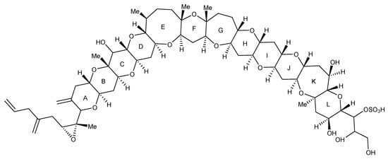 Other metabolites produced by Gambierdiscus include gambieroxide (Figure 5) [], a metabolite with 12 continuous trans-fused ether rings, a sulphate ester, an epoxide and an olefinic sidechain []. Currently, there is no toxicity information available on gambieroxide.