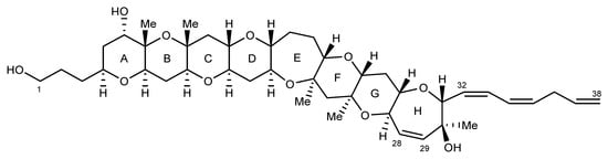 Gambierol (Figure 6) [] is a very lipophilic analogue with eight continuous trans-fused ether rings and a heptatriene sidechain. It displays potent neurotoxicity against mice when administered by i.p. injection, with neurological symptoms similar to those exhibited in CP events. It is a potent voltage-gated potassium channel blocker [,], as well as a functional antagonist of site five in neuronal VGSCs. The latter has a similar mode of action as the P-CTXs. Two independent studies reported that the C-28–C-29 double bond in the seven-membered ring H, and the unsaturated hydrocarbon sidechain C-32–C-38, are structural characteristics crucial for the potent toxicity of gambierol [,].