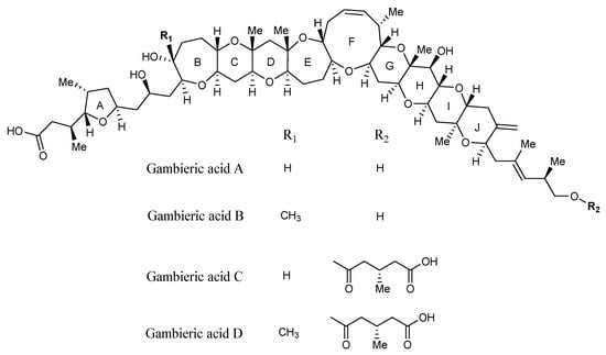 Lastly, gambieric acids consist of nine continuous trans-fused rings. Four analogues have been characterised: gambieric acid A and B and the 3-methylhemiglutarate forms, gambieric acid C and D, each containing a carboxylic acid functionality (Figure 7) [,]. These compounds displayed strong antifungal activity, yet had no toxicity to mice via i.p. injection []. It is unknown if other secondary metabolites produced by Gambierdiscus display the same antifungal activity.
