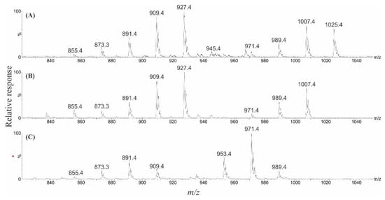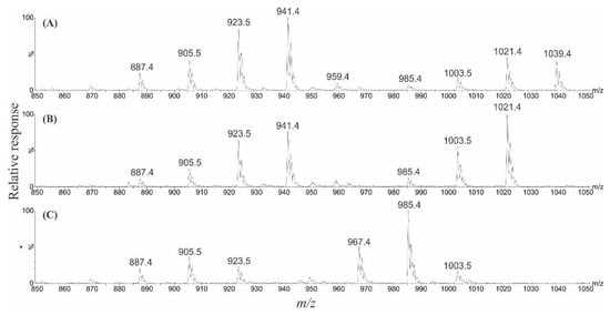 Full scan +ESI mass spectra (displaying m/z 850–1050) showing the [M + H]+, sequential [M + H − nH2O]+, and a series of [M + H − SO3 − nH2O]+ ions, of (A) 44-MG [M + H]+ m/z 1039.4, eluting at 3.65 min, (B) 38-deoxy-44-MG [M + H]+ m/z 1021.4, eluting at 3.75 min, and (C) dianhydro-44-MG [M + H]+ m/z 1003.5, eluting at 3.95 min.