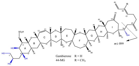 Chemical structure of gambierone and 44-methylgambierone (44-MG) showing the location where in-source fragmentation occurs between C-38 and C-39 (m/z 899) and the five possible locations for the anhydro and dianhydro variations to occur (labelled in blue).