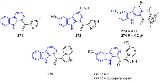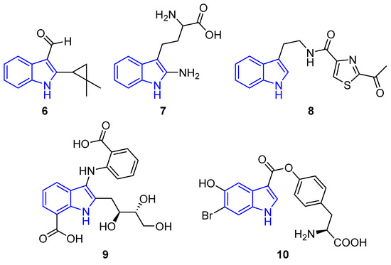 The presence of carbonyl or carboxyl groups in the indole ring has demonstrated different and interesting biological activities [28,36,37]. Compound 6, an indole carbaldehyde obtained from E. chevaleri KUFA 0006, a culture of an endophytic fungus, exhibited inhibitory activity against S. aureus ATCC 2592 biofilm settlement [38]. Hytiodoline (7) an indole amino acid obtained from the Hyrtios sponge, demonstrated potent anti-trypanosomal activity [39]. Becillamide A (8), a thiazole indole derivative obtained from Bacillus sp. marine bacterium, showed antibiotic activity against Archangium gephyra, immunosuppressing the myxobacterium [40]. Anthranoside (9), containing a carboxylated aniline, was obtained from the sponge-originated actinomycete, Streptomyces sp. CMN-62, and exhibited anti-influenza activity against the H1N1 virus and inhibited the reaction to NFκB [41]. Hermanine D (10), isolated from ascidian Herdmania momus, could inhibit the mRNA expression of iNOS, consequently provoking an anti-inflammatory effect [37] (Figure 5).