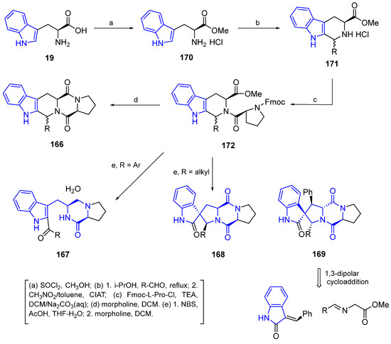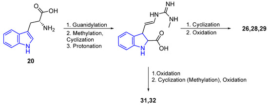 A hypothetical method for the biosynthesis of trachycladindoles has been described by A. Hentz. The route starts with tryptophan (20), and trachycladindole A–G (26–32) is obtained in 5 steps [53] (Figure 11).