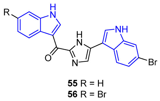 Bromodeoxytopsentin (55) and dibromodeoxytopsentin (56) feature an unsaturated imidazole bridging the indole moiety (Figure 17). Compound 55, isolated from the Topsentia pachastrelloides sponge, demonstrated antibacterial effects against both the susceptible and methicillin-resistant strains of S. aureus [65]. Compound 56, obtained from a genus of the marine sponge Topsentia, also exhibited antibacterial properties against S. aureus (MIC = 22.7 μM) and showed additional potential as an antiviral agent against HIV (YU2, IC50 = 57 μM) [63].