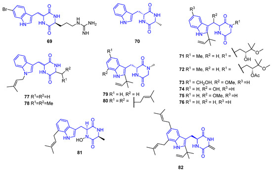 Cyclo(L-Trp–L-Ala) (70), Rubrumlines F (71), G (72), J (73), M (74), N (75), and O (76), 5-Piperazinedione 77, 2,5-piperazinedione 78, and Preechinulin (79), found in the marine-derived fungus Eurotium rubrum, demonstrate an effect against the influenza virus strain A/WSN/33 (H1N1) [81]. Echinulin (80), extracted from the marine-derived fungus Eurotium rubrum MPUC136, presents two isoprene units in the indole core and showed inhibitory activity against B16 melanoma cells [81,82].