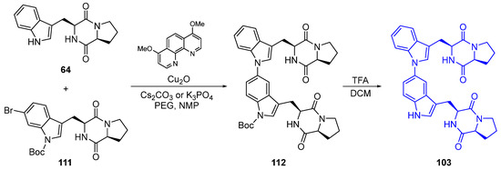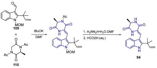 Cristatumin A (87), isolated from Eurotium cristatum EN-220, showed antibacterial activity against S. aureus and E. coli (IC50 = 64 and 8 μg/mL). As far as we can ascertain, its synthesis has not been reported yet [85]. Aspechinulins C (88), isolated from the fungus Aspergillus sp. FS445, exhibited the most potent inhibitory activities against nitric oxide (NO) production in comparison to other Aspechinulins compounds (IC50 = 20–90 mM) [86].