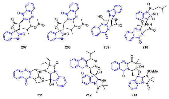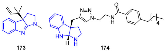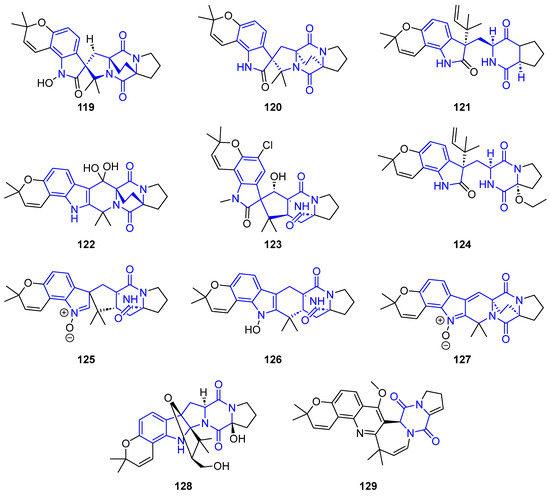 14-Hydroxyterezine D (81) was derived from Aspergillus sydowi PFW1-13 and showed weak cytotoxic activity towards A549 (IC50 = 7.31 µM). Further, it was active against HL-60 cells (IC50 = 9.71 µM) [77]. Didehydroechinulin (82) was isolated from Eurotium cristatum EN-220 and showed potent lethal activity against brine shrimp and a weak nematicidal effect against Panagrellus redivivus (IC50 = 27.1 μg/mL) [83]. Both have one and two isoprene units in the indole core respectively.