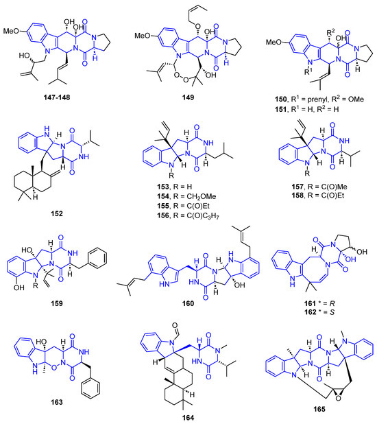 This classification has been organized according to the monoindole diketopiperazines containing a diketopiperazine ring attached at the C3 indol core with a methylene bridge (Figure 22 and Figure 23). These indole DKPs are commonly isolated from fungi, such as Aspergillus, and Penicillium, among others [72]. An example of a marine bioactive indole diketopiperazine alkaloid is Brevianamides, which originated from tryptophan and proline.