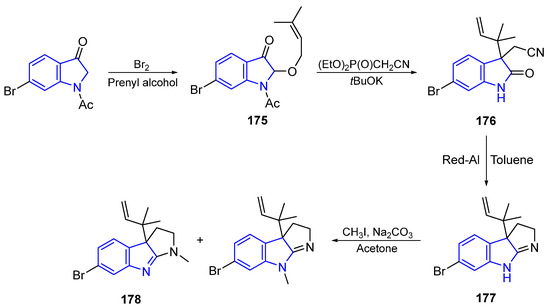 May Zin et al. proposed the biogenesis of isomer compounds 18 and 19, starting with L-tryptophan (20). Isomer 17 was obtained in five steps, and isomer 19 required one additional isomerization step (Figure 8) [38].