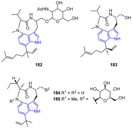 Prenylated indoles include several different families of compounds. For better insight for the readers, the PIAs are arranged in ascending order of complexity, ranging from an indole core with a cyclic prenyl substituent to an indole moiety fused with a variable number of prenyl-derived ring systems. PIAs containing the indole core with acyclic prenyl substituents are included in Section 2.1.