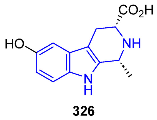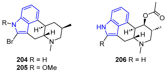 Simple indole alkaloids consist of an indole nucleus with distinct substitution patterns at the N1, C3, C4, C5, C6, C7, and C8 positions [28,29]. In this section, the compounds of this group are ordered according to the complexity of the substituents of the indole moiety, starting from acyclic to cyclic ones.