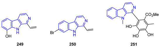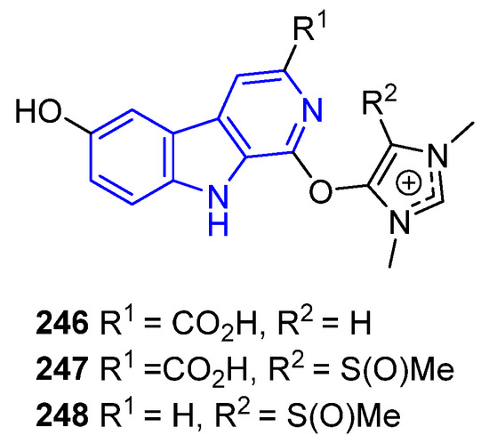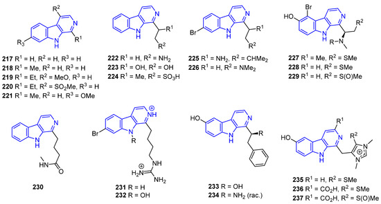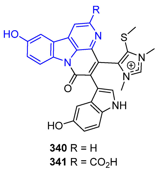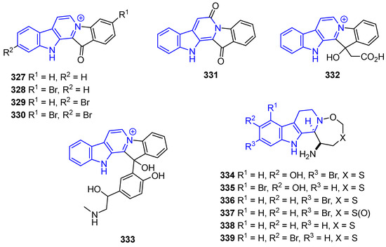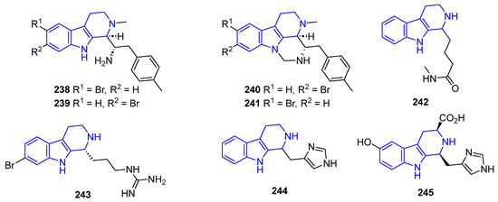 Meridianins B–E (42–45) are notable for their demonstrated cytotoxic effects against adenocarcinoma and murine mammary tumor cell lines (IC50 = 11.4, 9.3, 33.9, and 11.1 μM, respectively) [55]. Moreover, 44 exhibited antibiofilm potential against methicillin-resistant Staphylococcus aureus (MRSA) [36]. In general, the Meridianin family demonstrated wide biological activities which are summarized in Table 1 [56,57].