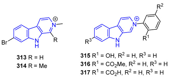 - Suzuki, K.; Nomura, I.; Ninomiya, M.; Tanaka, K.; Koketsu, M. Synthesis and Antimicrobial Activity of β-Carboline Derivatives with N2-Alkyl Modifications. Bioorg. Med. Chem. Lett. 2018, 28, 2976–2978. [Google Scholar] [CrossRef]