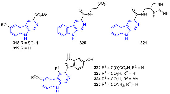 Meridianins A–G (41–47) are a family of SIAs characterized by having pyrazine rings at the C3 position (Figure 13). Meridianins are obtained from several sources, but mainly tunicates. Thus, the first was Aplidium meridianum, from which Meridianins A–E were isolated, [55] but other examples include Aplidium falklandicum and Synoicum sp. [56].
