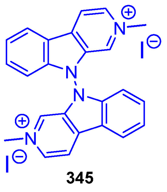 Bis- and tris-indole alkaloids are characterized by the linkage of the indole moieties through (hetero)carbonated chains, typically between the C3 positions [36]. Usually, when indole alkaloids are bridged by an imidazole ring, they exhibit interesting biological activity. Examples of such cases are bis-indoles Dihydrospongotine C (50), Spongotine C (52), and the tris-indole Tulongicin (54), isolated from the sponge Topsentia. They have demonstrated antiviral activity against HIV, HxB2, and YU2, with IC50 values ranging from 2.7 to 12 μM and 3.5 to 9.5 μM, respectively, as well as antimicrobial and antibacterial properties, particularly against S. aureus (MIC = 1.8 to 7.6 μM) [63] (Figure 7). Furthermore, Rhopaladin C (53), isolated from a marine tunicate, demonstrated antimicrobial efficacy against Sarcina lutea and Corynebacterium xerosis (IC50 = 36.9 μM) [64]. Lastly, Spongotine A (51) was isolated from the Topsentia pachastrelloides sponge and showed antibacterial effects against both the susceptible and methicillin-resistant strains of S. aureus [65] (Figure 16).