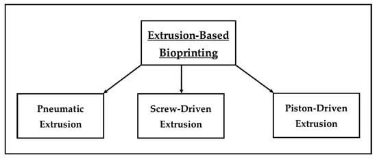 There are three common classes of extrusion-based bioprinting (Figure 2): pneumatic extrusion (driving force: pressure), piston-driven extrusion (driving force: vertical mechanical force), and screw-driven extrusion (driving force: rotational mechanical force) [19]. Among the three classes of extrusion-based bioprinting, pneumatic extrusion is the most commonly used method [72].