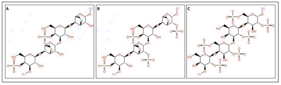 Chemical structures of carrageenans: (A) the structure of κ-carrageenan, (B) the structure of ι-carrageenan, and (C) the structure of λ-carrageenan. The structures were obtained from the MetaCyc database using the keywords “Kappa (κ)-carrageenan” [128], “Iota (ι)-carrageenan” [129], and “Lambda (λ)-carrageenan” [130] for the compound search.