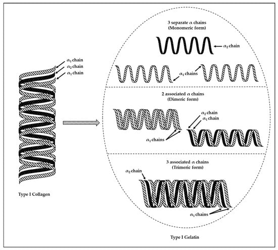 Gelatin is a natural protein polymer, derived from collagen through hydrolytic degradation involving the breakage of crosslinks between collagen polypeptide chains as well as a partial cleavage of polypeptide bonds [136,143]. Type I gelatin is derived from Type I collagen. The hydrolytic degradation of Type I collagen (which contains two identical α1-chains and one α2-chain) results in a gelatin mixture comprising either separate (i.e., dissociated) or linked (i.e., associated) α1- and α2-chains. Therefore, the produced Type I gelatin would be a heterogeneous product with several polypeptide chain combinations (Figure 8). These combinations comprise the monomeric form (three separate chains—two α1-chains and one α2-chain), the dimeric form (two chains covalently crosslinked or in dimeric form—either two α1-chains linked together or one α1-chain linked to one α2-chain), as well as the trimeric form (three covalently crosslinked chains—two α1-chains linked to one α2-chain) [138].