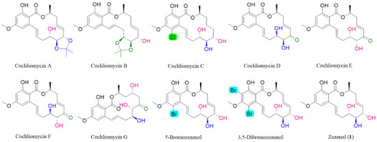 The search for new bioactive natural products and derivatives from marine-derived fungi is an ongoing focus of our laboratory. One of our research subjects focuses on resorcylic acid lactones (RALs), polyketide natural products with a 14-membered macrocyclic ring fused to a resorcylic acid residue, which have antibacterial, antifouling, antimalarial and other activities [23,24]. In our previous research, a series of bioactive natural 14-membered RALs (Cochliomycins A–G, 5-Bromozeaenol and 3,5-Dibromozeaenol) were isolated from the marine-derived fungus Cochliobolus lunatus (Figure 1) [23,25,26,27]. Especially, cochliomycin A, at a concentration of 1.2 μg/mL, showed significant antifouling activity against the barnacle Balanus Amphitrite [23]. In addition, a series of 14-membered RAL derivatives with antiplasmodial and antifouling activities have been discovered [25,26,27,28,29,30].
