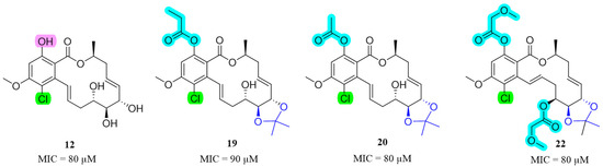 An overview of the MICs of this 14-membered RAL library in combination with their structures gives preliminary insights of SARs: (1) the anti-M. marinum activity of 14-membered RALs can be significantly improved via the introduction of the chlorine atom at the C-5 position, as seen by comparing the MICs of 1/12; (2) bearing an acetonide group at position 5’6’ reduces activity, as seen by comparing the MICs of 12/18; (3) the acetyl- and propanoyl-substituted phenolic hydroxy group enhanced activity when both the chlorine atom, and an acetonide group at 5’6’ were also present (19, 20 and 22); (4) a comparison of compound 12 with compounds 9–11 indicates that when the phenolic hydroxy group is transformed into an ether, the activity decreases.
