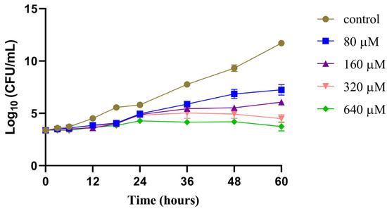 The time–growth curve was determined using the method of Li et al. [35]. Initially, the concentration of M. marinum was set at 105 CFU/mL, and 5 groups were chosen, each group tested on 6 times. The drug concentration of the dosing group was set at 640, 320, 160 and 80 μM. An equal amount of DMSO was added to the blank group, and the suspension of M. marinum was incubated at 32 °C (100 rpm) by oscillating it. The colony count was determined and counted using the OD600 at the planned time points (0, 3, 6, 12, 18, 24, 36, 48 and 60 h).