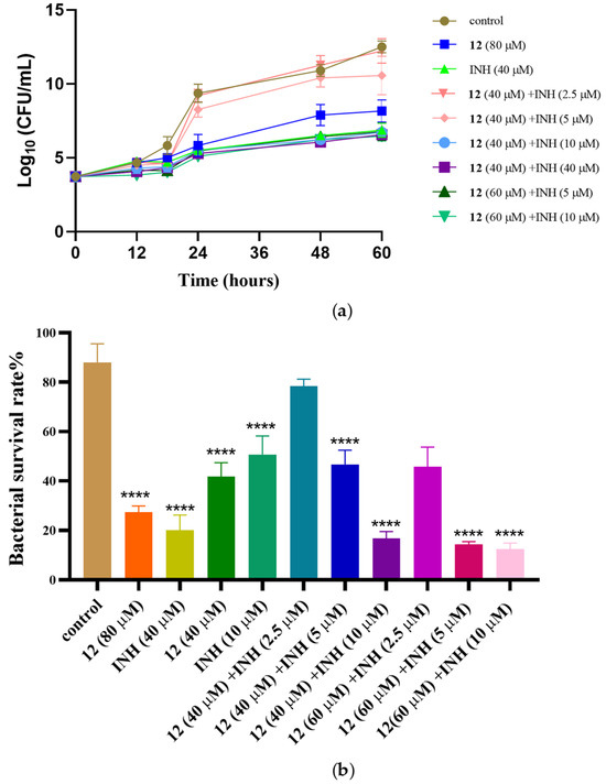 Compound 12 in combination with positive drugs isoniazid (INH). (a) Time–growth curves of M. marinum strain treated with different concentrations of compound 12 and INH; (b) different concentrations of 12 and INH inhibit the growth of M. marinum. The number of bacterial cells was measured at 48 h. Data are presented as the mean of three experiments ± SD. **** p < 0.0001 compared with the control group.