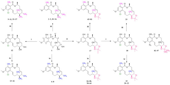 The fermentation condition of Cochliobolus lunatus (CHNSCLM-0009) was liquid fermentation. The crude extract obtained after fermentation was subjected to silica gel column chromatography (CC) and recrystallization, and a total of 7.54 g of zeaenol (1) was obtained [29,30]. 97 derivatives were semi-synthesized using zeaenol (1) as a starting material through one to three steps (Scheme 1). Synthetic schemes for some of the compounds (2–18, 20–23 and 39–97) can be seen in reference [30].