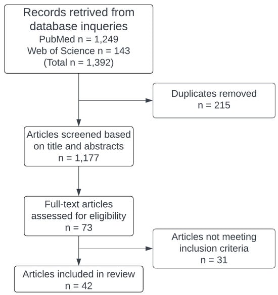 Overview of the selection process of articles included in this review. Flow chart created in Lucid (lucid.co, https://community.lucid.co/admin-questions-2/question-publishing-lucidchart-figures-in-academic-journals-and-citation-5969, accessed on 1 February 2024).