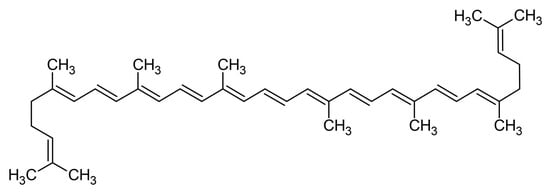 Figure 1 illustrates the main structure of carotenoids, called lycopene, an acyclic carotenoid. The middle region of carotenoid structures is characterized by a sequence of alternating single and double bonds, named the chromophore. The conjugated system’s π-electrons delocalize across the chromophore, causing light absorption in the visible spectrum and, therefore, the coloration of the tissues and carotenoids that contain them. Formally, all carotenoids may be produced by any combination of the following processes from the acyclic C40H56 structure: (i) hydrogenation, (ii) dehydrogenation, (iii) cyclization, or (iv) oxidation [22].