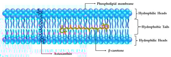 When compared to other carotenoids, astaxanthin has been proven to demonstrate superior antioxidant effects, due to its unique structure and functional reactive end groups. Specifically, Naguib et al. [47] developed a novel fluorometric assay, utilizing BODIPY 665/676 as the indicator, Trolox as the calibrator, and AMVN as the peroxyl radical generator for experimenting with liposomal and organic media, concluding that the relative reactivities of Trolox, astaxanthin, α-tocopherol, β-carotene, lutein, α-carotene, and lycopene were 1.0, 1.3, 0.9, 0.5, 0.4, 0.2, and 0.4, respectively. A more targeted comparison between the most powerful carotenoids, astaxanthin and β-carotene, correspondingly demonstrated astaxanthin’s superiority in liposome peroxidation induced by ADP and Fe2+, with a 2-fold potential for inhibiting their production. A remarkable finding is the ability of astaxanthin’s ring moiety to scavenge free radicals both in the membrane and on the membrane’s surface, while both carotenoid polyene chains trapped free radicals only inside the membrane. This antiperoxidative behavior against liposomes can offer insight into the different placement of the molecules inside the cellular phospholipid membrane, where the polar ends of astaxanthin can interact with the hydrophilic region of the membrane by forming hydrogen bonds, while β-carotene only has the ability to intervene in oxidation through the lipophilic part of the membrane (Figure 3) [48].