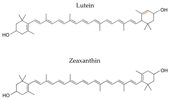 Lutein is a non-provitamin A, xanthophyll carotenoid with an expected market value of EUR 409 million with a CAGR of 6.10% over the projected time frame (2020–2027) [76]. It is abundant in green vegetables and herbs, as well as in microalgal strains, with the most important being Chlorella pyrenoidosa, zofingiensis, and Spirulina platensis. Its isomer compound, zeaxanthin, only differs at the position of one of the ring’s double bonds (Figure 6), with similar natural sources and a much smaller market size estimated at USD 210 million with a CAGR of 8.2% until 2030 [76]. Both molecules are key antioxidant elements of the human retina, with a ratio of lutein/zeaxanthin of 3:1 [77], inhibiting ophthalmological diseases caused by light exposure.