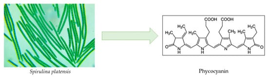 Phycobiliproteins (PBPs) are a class of complex proteins that serve as auxiliary pigments in the algal chloroplast, by harvesting light in the visible spectrum and transferring the stored energy to chlorophyll molecules indirectly in a sufficient degree (95%), while preventing photolysis of the microalgal cells occurring during photosynthesis [95,96]. Specifically, depending on the wavelength absorbance, they can be classified as (i) purple phycoerythrins, λmax = 540–570 nm (ii); orange phycoerythrocyanins, λmax = 560–600 nm; (iii) blue phycocyanins, λmax = 610–620 nm; and (iv) blue-green allophycocyanins, λmax = 650–655 nm [96]. They are biodegradable, innocuous, hydrophilic compounds, of a great molecular weight (220–300 kDa), composed of two main subunits, α and β, which stabilize each other through electrostatic forces and form steady trimers (αβ)3 or hexamers that promote solar light absorbance [97]. Their chromophore parts consist of open chain tetrapyrroles bonded to cysteine covalently via thioether linkages, which are different for every subtype of PBP, functioning as a diagnostic for the integrity of its structure, since it maintains its color only in its natural form [98].